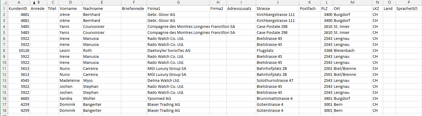 | 2 | Anrede (z.B. Frau, Herr) | 20 | zwingend | Falls es sich um eine Personenadresse (sozusagen privat) handelt oder um eine Firmenadresse mit Kontaktperson. | |