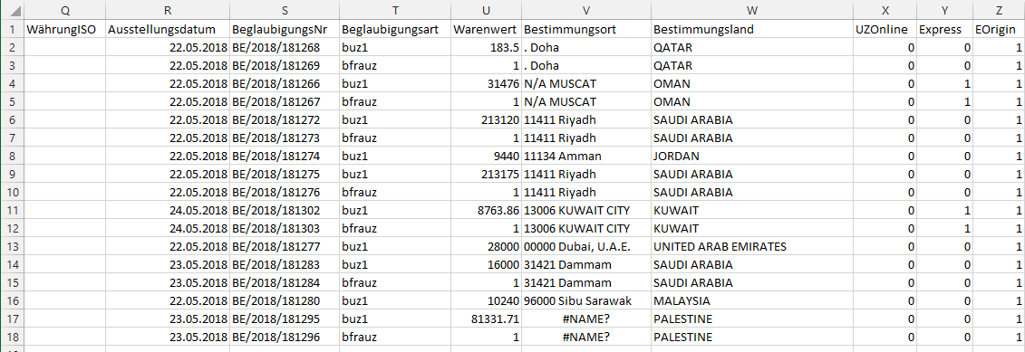 Falls die Spalte 33 (Auftragsnummer) im Importfile unmittelbar aufeinander folgend denselben (nicht leeren) Inhalt hat, werden diese Beglaubigungen in denselben Lieferschein übernommen.