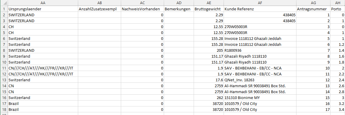 - Grundsätzlich sind immer alle 34 Felder zu liefern, auch wenn sie leer bzw. fakultativ sind, d.h. das gelieferte Dokument enthält immer genau 34 Spalten.