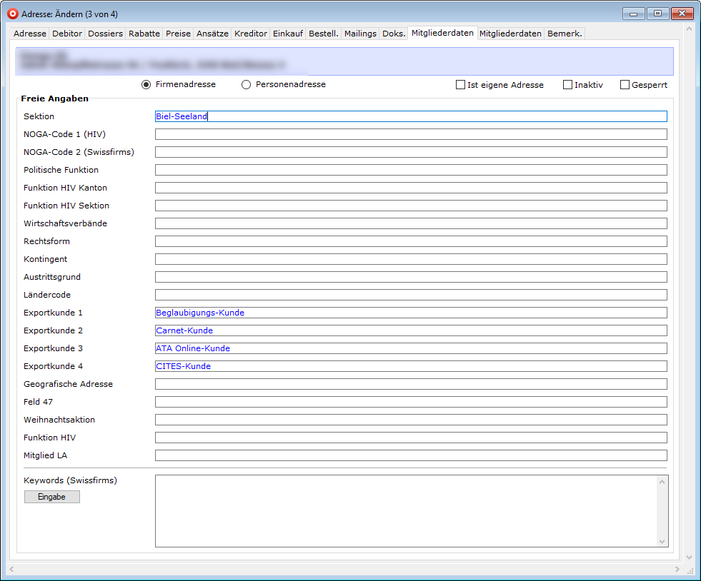 Neben den Verbindungsdaten sind bei den Personen die Keywords zu hinterlegen, die im Firmen-Register Nummern und Kontakte erscheinen.