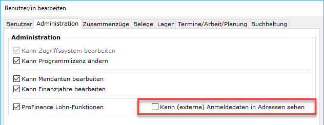 braucht es die Freischaltung des Benutzerrechts im Zugriffssystem "Kann (externe) Anmeldedaten in Adressen sehen".