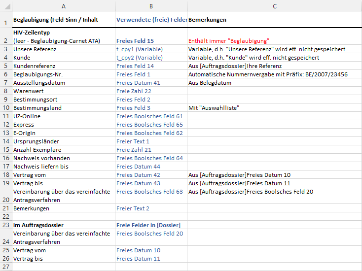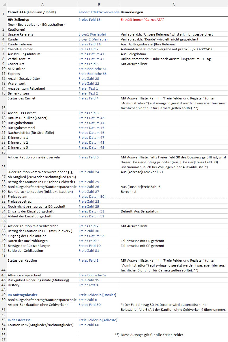 Die nachstehende Tabelle zeigt einerseits die Felder gemäss den "normalen" Standard-Belegzeilen und andererseits alle zusätzlichen Freien Felder, die für die Beglaubigungen und die Carnets ATA notwendig sind.