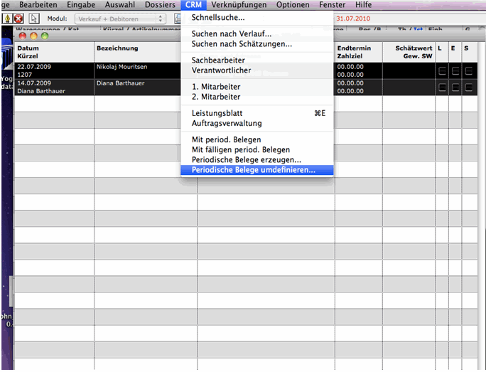 umdefinieren Die ausgewählten Auftragsdossier markieren. In der Menüliste den Punkt CRM anklicken und Periodische