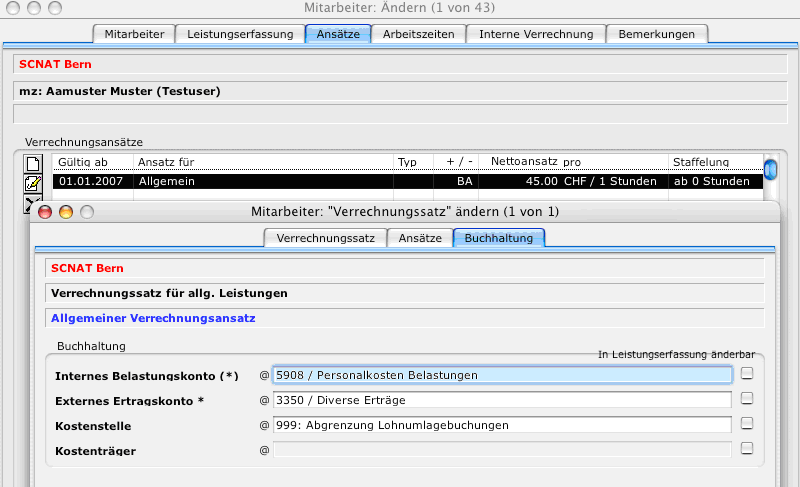 Jedem Mitarbeiter ist ein interner Ansatz für die Verrechnung zu hinterlegen. Dieser Ansatz kann nach einer bestimmten Formel (z.B. Jahreslohn x 130% / Sollstunden Jahr) ermittelt werden.