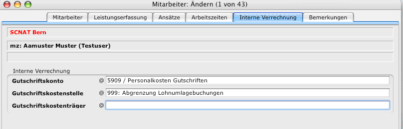Im Register "Interne Verrechnung" wird auf dem Mitarbeiter die Gutschrift der internen Leistungen definiert.