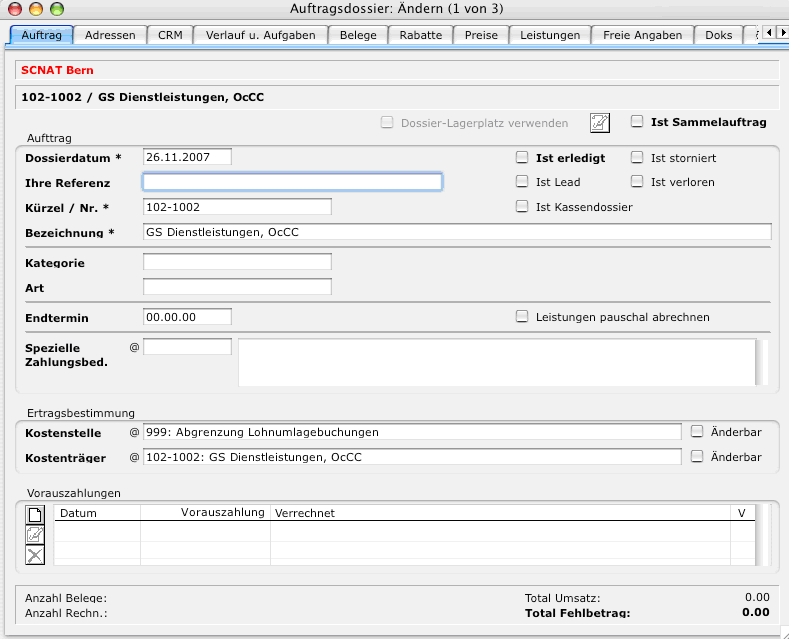 Hinweis: Pro Kostenträger ist ein Auftragsdossier anzulegen.
