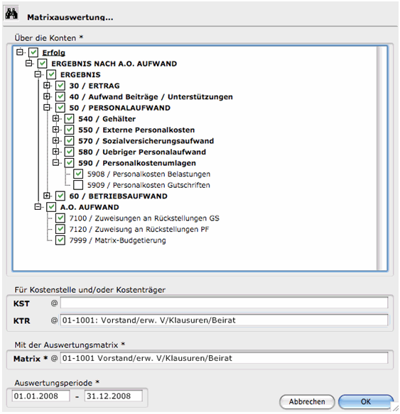 - Es ist der auszuwertende Kostenträger auszuwählen - die damit verknüpfte Matrix wird automatisch gefunden.