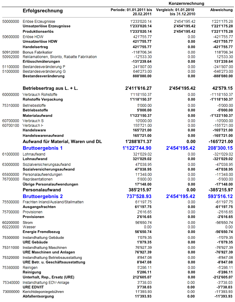 Beispiel für Auswertungen nach Auswertungsfeldern In SuperReports können z.B. Konzernkonten mit Saldo Aktueller Monat, Saldo Vormonat und Abweichungen ausgewertet werden. Nachstehend Beispiele mit Testdaten: