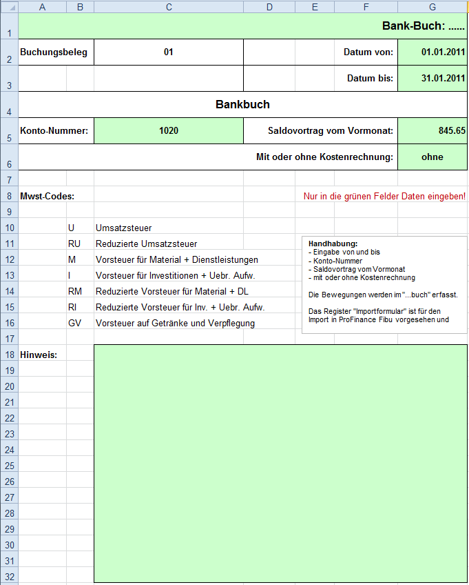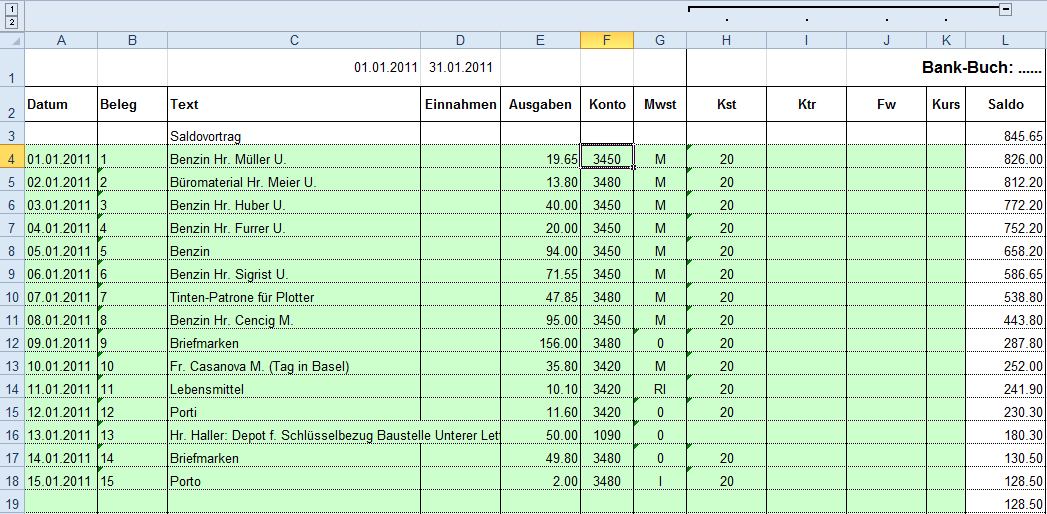 - Im zweiten Register (z.B. Bankbuch) werden die Buchungen zeilenweise erfasst.