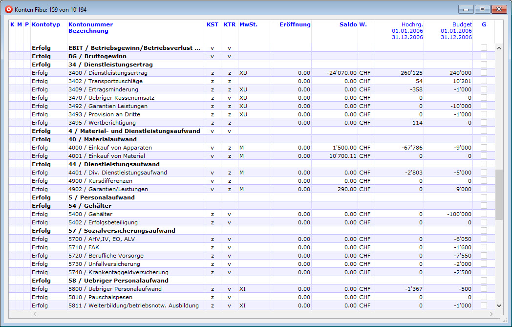 Es werden entweder die Fibu-Konten oder die Kostenstellen oder die Kostenträger mit ihren Strukturen und Salden aufgelistet.