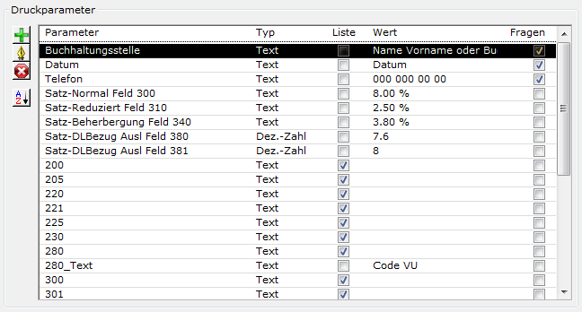 Einträge angepasst bzw. ergänzt werden (insbesondere, wenn neue oder andere Mwst-Codes hinzugekommen sind). Parameter, die vor jedem Ausdruck abgefragt werden: