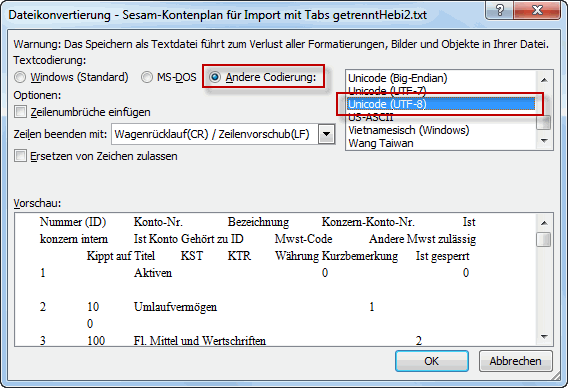 Es lassen sich aus den bisherigen bossERP- oder andern Applikationen Kontenpläne im ASCII-Format (= Textformat) exportieren, in Excel öffnen, auf das von bossERP vorgeschriebene Format bearbeiten und importieren. Wichtig ist, dass vor dem Import von Standard-Kontenplänen in bossERP der Dateiursprung in Excel auf Unicode (UTF-8) festgelegt wird. Das geschieht wie folgt:
