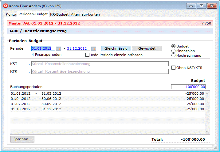 | Gewichtet verteilen | Derzeitige Verteilung nach Tagen der Perioden. Die echte Gewichtung in Prozenten ist noch pendent in der Umsetzung. Man kann aber durch die manuelle Eingabe der Periodenwerte eine Gewichtung manuell vornehmen. |