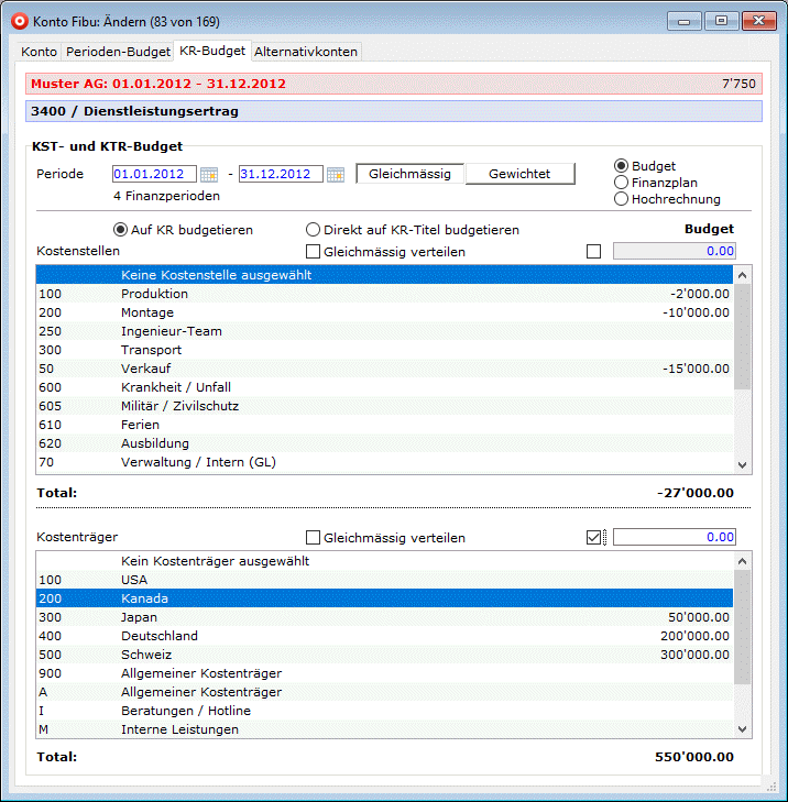 | Auf KR budgetieren | einzelne Kostenstelle oder einzelner Kostenträger gesamthaft |