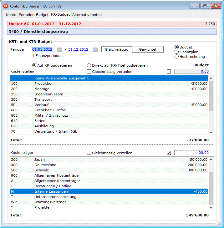 | Checkbox "Gleichmässig verteilen" | auf ALLE Kostenstellen oder Kostenträger Hinweis: Sind der Button "gleichmässig" und die Checkbox "gleichmässig verteilen" gestellt, werden die Zahlen einerseits gleichmässig auf die Perioden und innerhalb der Perioden gleichmässig auf die Kostenstellen bzw. Kostenträger verteilt. Und darum: falls 12 Perioden und mehrere Kostenstellen oder Kostenträger vorhanden sind, kann es sein, dass durch die arithmetische Verteilung das Gesamt-Total z.B. 9'999.99 ergeben kann. Liegt so eine Konstellation vor, dann kann mittels Zurückstellen der Checkbox "gleichmässig verteilen" eine Zahl angepasst werden, damit das Gesamttotal wieder übereinstimmt. |