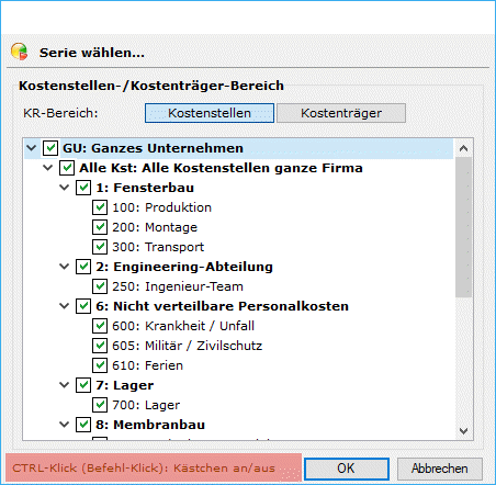 Mit der Tastenkombination ALT- und Klick auf den Export-Button können die Daten nach Kostenstellen oder Kostenträger in einem Schritt einzeln der Reihe nach exportiert werden. Mit diesem "Serienexport" wird für jede markierte KR-Struktur je ein eigenes Exportdokument im Textformat erstellt, welche anschliessend mit Excel geöffnet werden können (mit "Ansichten exportieren" werden im Gegensatz zur vorher erläuterten Methode alle Daten in nur einem Dokument exportiert):