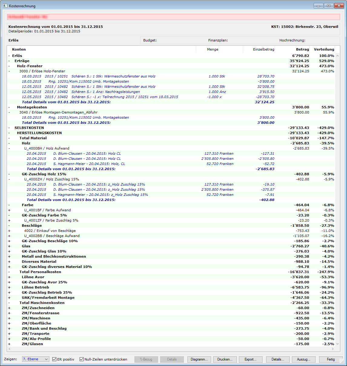 Die Umsätze und Kosten werden gemäss Strukturierung (mit oder ohne Details) dargestellt: