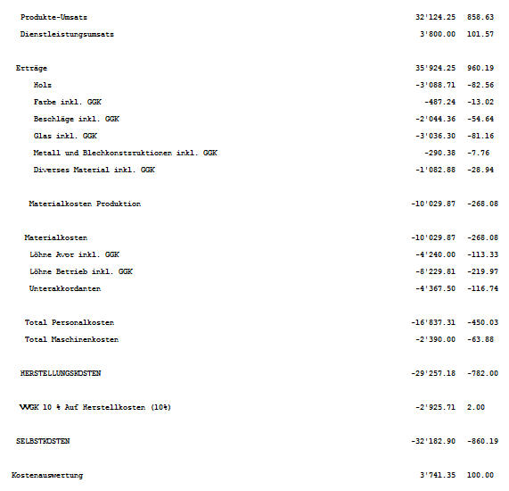 Anhand eines Reports können die Umsätze und Kosten detailliert oder - wie nachstehend - zusammengefasst gedruckt werden, wobei im Report ein genereller Verwaltungs- und Vertriebskostenzuschlag ermittelt, angedruckt und in den Selbstkosten eingerechnet wird.