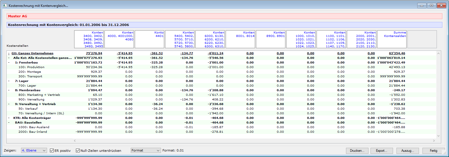 Sofern diese Spezialauswertung freigeschaltet ist und der Benutzer im Zugriffssystem das individuelle Fibu-Auswertungsrecht hat, können insgesamt 10 - bzw. falls mit Budgetvergleich: 5 - Aufwand- oder Ertragskonten (oder Bereiche davon) spaltenmässig über alle Kostenstellen oder alle Kostenträger dargestellt werden. In den Spalten erscheinen die Konten bzw. Kontenbereiche, auf den Zeilen alle Kostenstellen bzw. Kostenträger.