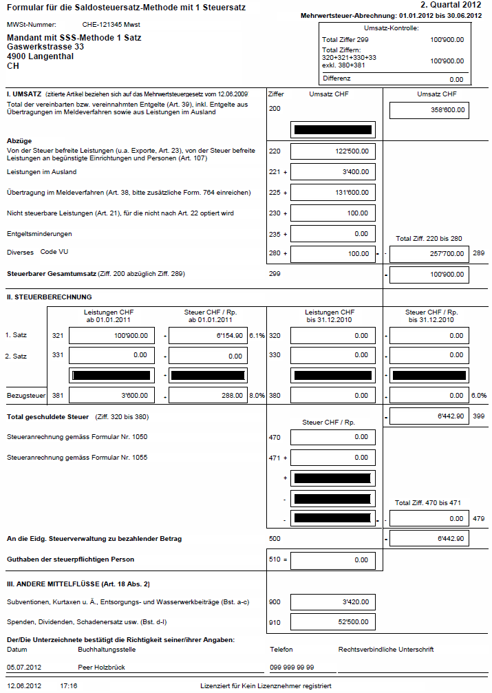 Mwst-Abrechnung für die Saldosteuersatz-Methode mit 1 Saldosteuersatz