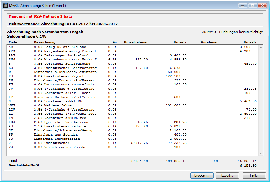Die Differenz zwischen der obigen Zusammenstellung zur gedruckten Mwst-Abrechnung ist der Betrag der Bezugssteuer, die manuell anlässlich der Mwst-Abrechnung nachgebucht wird.
