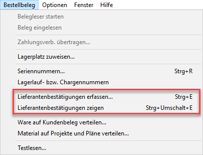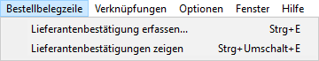 Mit dem Menübefehl Bestellbeleg - Lieferantenbestätigungen zeigen oder Shortcut Ctrl+Shift+E können die Lieferantenbestätigungen eingesehen und auch gelöscht werden: