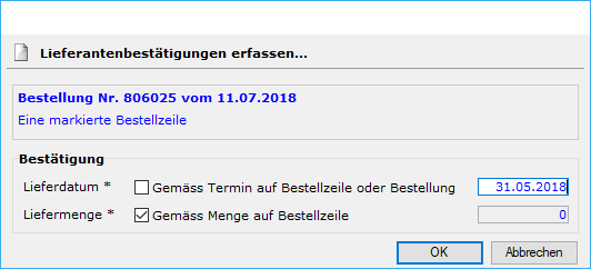 Bestehen keine Unterschiede zwischen den Bestätigungen des Lieferanten und den Bestellungen wird nur die erste Checkbox "Gemäss Termin auf Bestellzeile oder Bestellung" gesetzt. Damit wird für jede markierte Bestellbelegzeile eine Lieferantenbestätigung mit Datum und Menge der Bestellzeile angelegt.