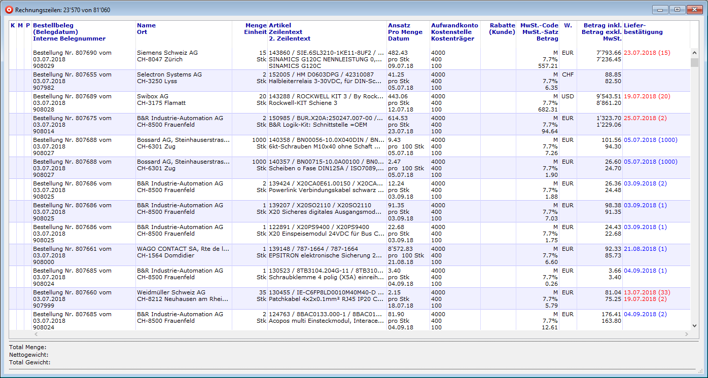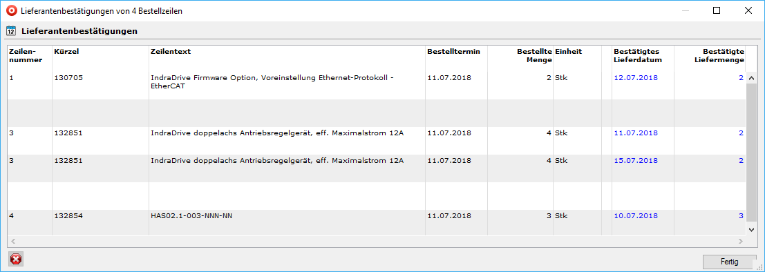 Ausgabeliste Bestellbelegzeilen mit Lieferbestätigungen