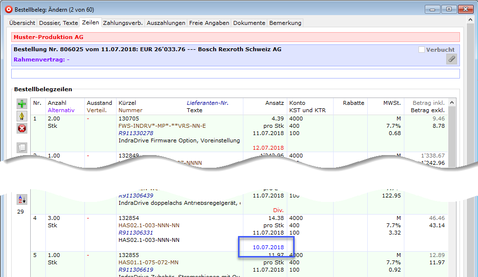 Wichtig: Das Feld Bestelltermin auf der Bestellbelegzeile wird nicht mehr angepasst, d.h. die Reservation im Lager bleibt auf dem ursprünglichen Termin.