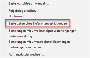 Im Output bei den Bestellbelegen können mit dem Menübefehl Verarbeiten - Bestellzeilen ohne Lieferantenbestätigung die entsprechenden Zeilen gesucht werden: