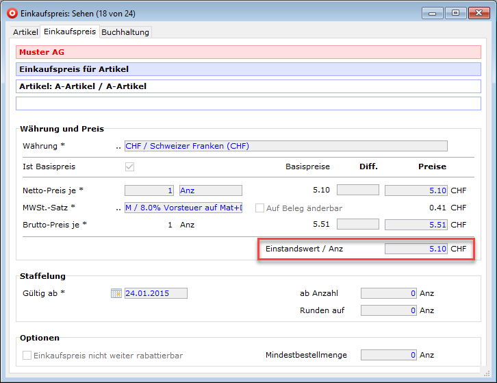 Menüpunkt Einkaufspreise - Einstandwerte berechnen