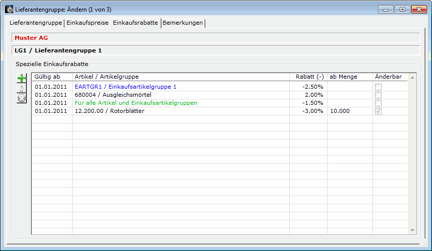 | Blaue Einträge | Einkaufsartikelgruppen-Rabatte für den entsprechenden Lieferanten bzw. Lieferantengruppe |