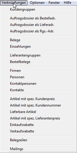 Verknüpfungen können auch indirekt geholt werden. Beispiel: Ich möchte die Fibu-Buchungen zu Einzahlungen einer bestimmten Adresse schnell finden. Einschränkung sind vom Zugriffssystem abhängig.
