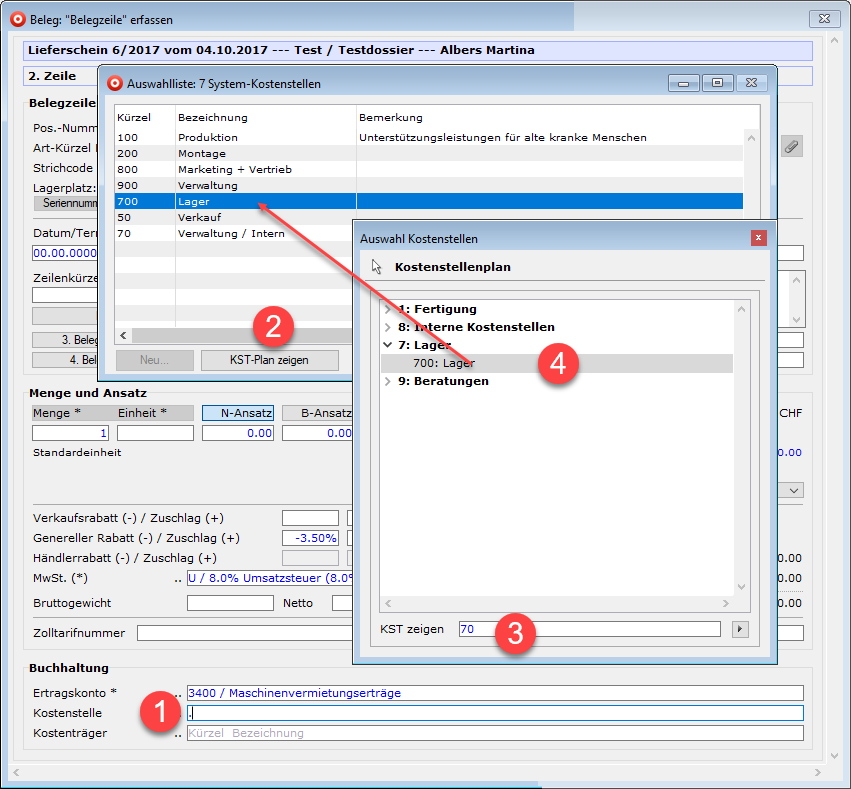 - Im Feld Kostenstelle wird mit . oder .. oder @-Zeichen nach der Auswahlliste gesucht.
