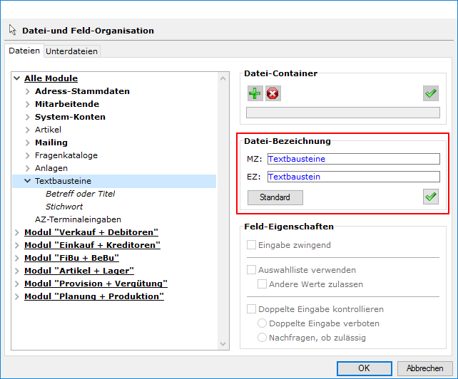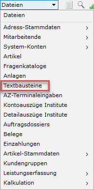 Erscheinen die Textbausteine allenfalls unter "Dateien" nicht oder ist der Menüpunkt Optionen - Textbaustein*) gedimmt, muss durch den Systemadministrator in der Datei- und Feldorganisation geprüft werden, ob folgende Einstellungen korrekt sind: