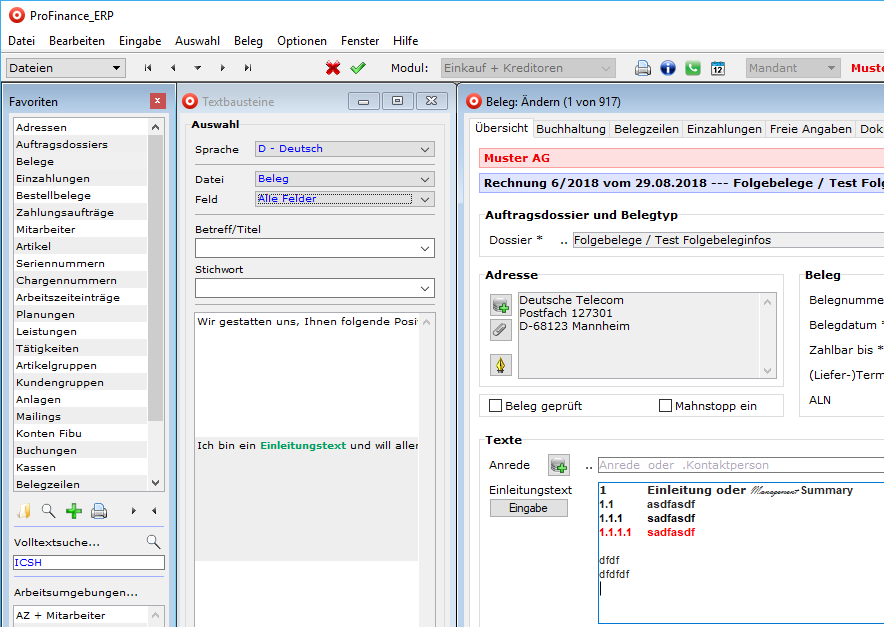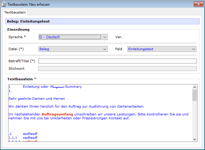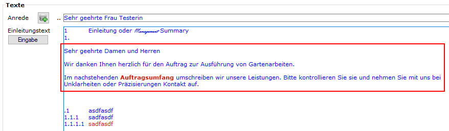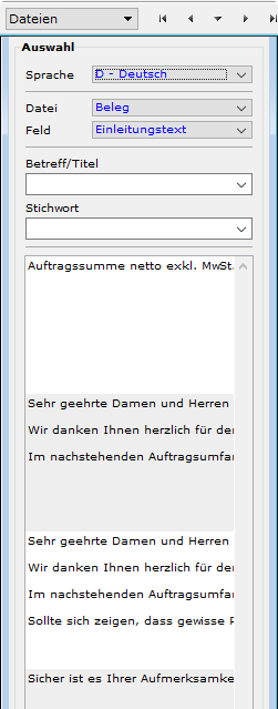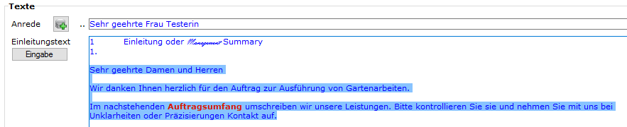 - Folgende Abbildung ist entstanden, weil der Cursor im Feld "Einleitungstext" des Beleginputs stand: