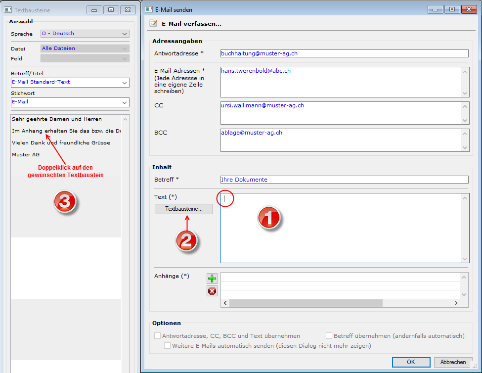 In Emails können ebenfalls Textbausteine verwendet werden. Am besten sind sie gemäss Variante 3(unter Verwalten von Textbausteinen) bereits vorgängig erfasst und demnach zur Verwendung vorhanden. Wenn sie vorhanden sind, dann kann wie folgt vorgegangen werden: