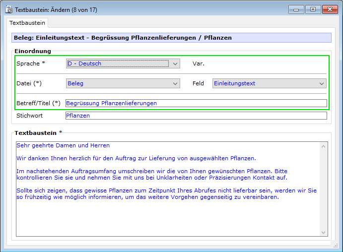 - wird im gewünschten Feld der Text eingetragen, der als Textbaustein abgespeichert werden soll:
