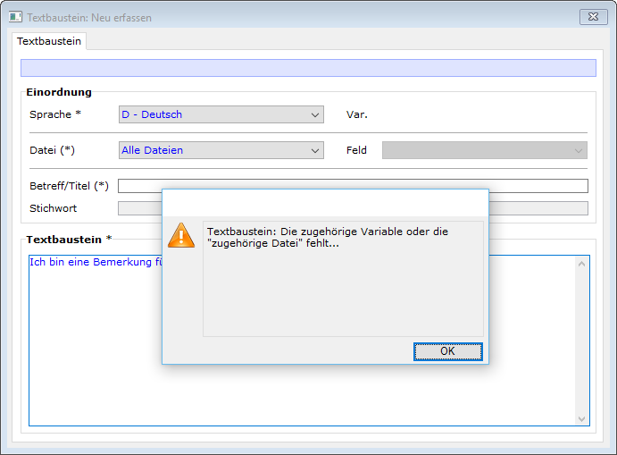 Diese Vorgehensweise funktioniert aber nicht immer, falls ein Textbaustein für "Alle Dateien" gelten soll. Dann kommt folgende Bemerkung: