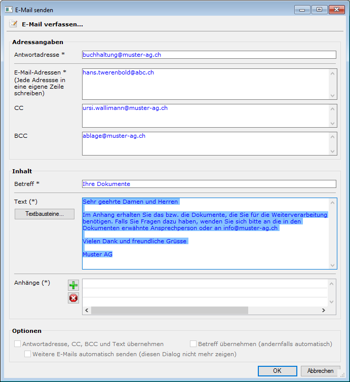 Hinweis: Auch für das Feld "Betreff" können Textbausteine erfasst werden. Sie erhalten die Variable T_EMAIL_BETREFF.