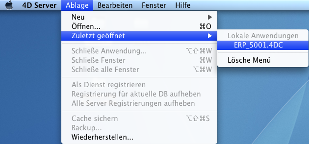 - Menüpunkt Ablage - Zuletzt geöffnet und die gewünschte Version .4DC wählenDoppelklick des Icons 4D Server.