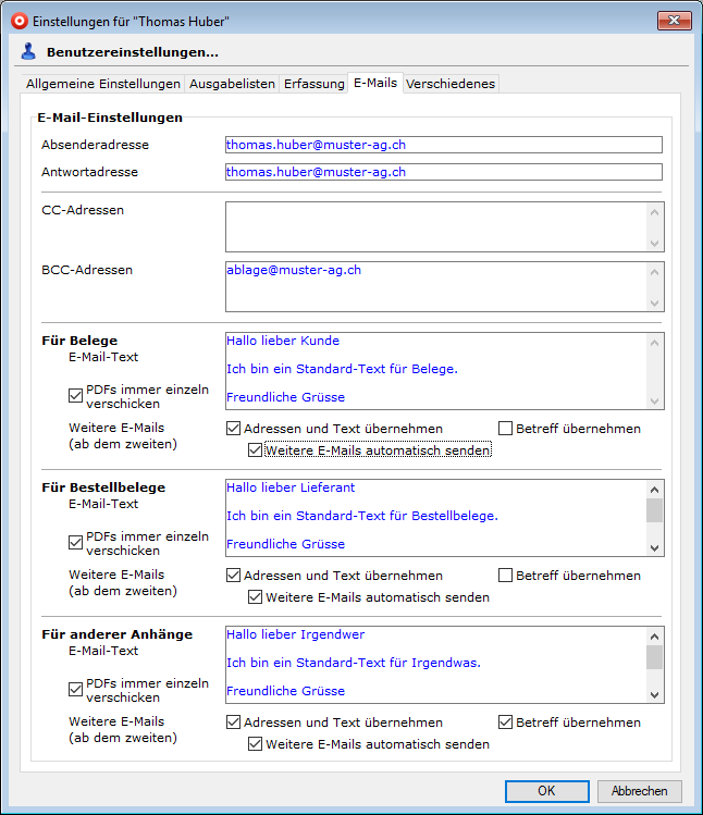 | CC | Gewünschte Standard-CC-Adresse für den Versand einer Mail-Kopie. Wird automatisch in die zu erstellenden Emails übernommen (siehe "Email schreiben"). |
