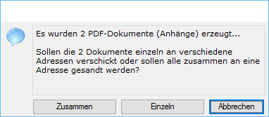 | PDFs immer einzeln verschicken | Wenn diese Checkbox gestellt ist, werden mehrfach markierte Datensätze einzeln an deren Adressaten (ohne Nachfrage, ob einzeln oder zusammen) versandt. Ist sie gestellt, wird nicht mehr gefragt, sofern Mailadressen vorhanden sind. Hinweis: Wird diese Frage nicht mehr gestellt, weil die Belege immer einzeln verschickt werden sollen, hat man auch nicht mehr die Möglichkeit, den Versand hier abzubrechen. |