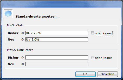 - Die mit neuen Mwst-Codes zu versehenen Auslagen (vermutlich alle extern zu verrechnenden) markieren und den Menüpunkt Tätigkeiten - Standardwerte ersetzen wählen