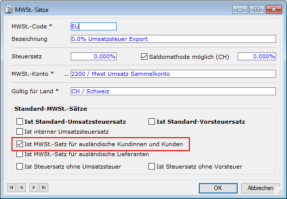 In den Mwst-Sätzen wird der Code EU Exportumsatz bestimmt, welcher für ausländische Kunden standardmässig vorgesehen ist: