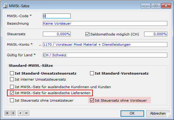 In den Mwst-Sätzen wird der Vorsteuer-Code 0 Keine Vorsteuer bestimmt, welcher für ausländische Kunden standardmässig vorgesehen werden kann: