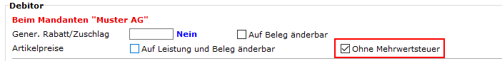 Damit dieser Mwst-Code standardmässig bei ausländischen Kundenbelegen gezogen wird, muss in der Adresse im Register Debitor die Checkbox "Ohne Mehrwertsteuer" gestellt sein:
