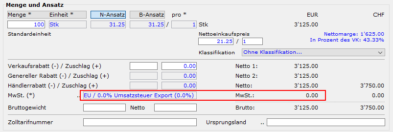 - Geschäftsvorfälle, die der Mwst "nur" abrechnungsmässig unterliegen, aber bezüglich Vor- und Umsatzsteuer einen Satz von 0.00% haben (z.B. Code EU für Exportumsatz)