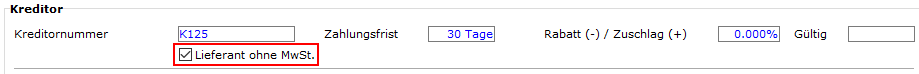 Damit dieser Vorsteuer-Code standardmässig bei ausländischen Lieferanten gezogen wird, muss in der Adresse im Register Kreditor die Checkbox "Ohne Mehrwertsteuer" gestellt sein: