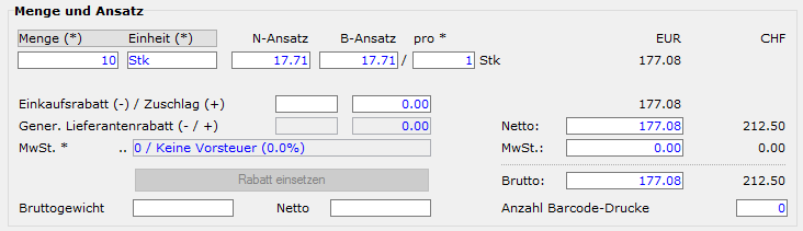 - Ist die Checkbox in der Adresse "Ohne Mehrwertsteuer" gestellt, kann der Vorsteuer-Code in der Bestellbelegzeile nicht geändert werden. Das Feld bleibt gedimmt.